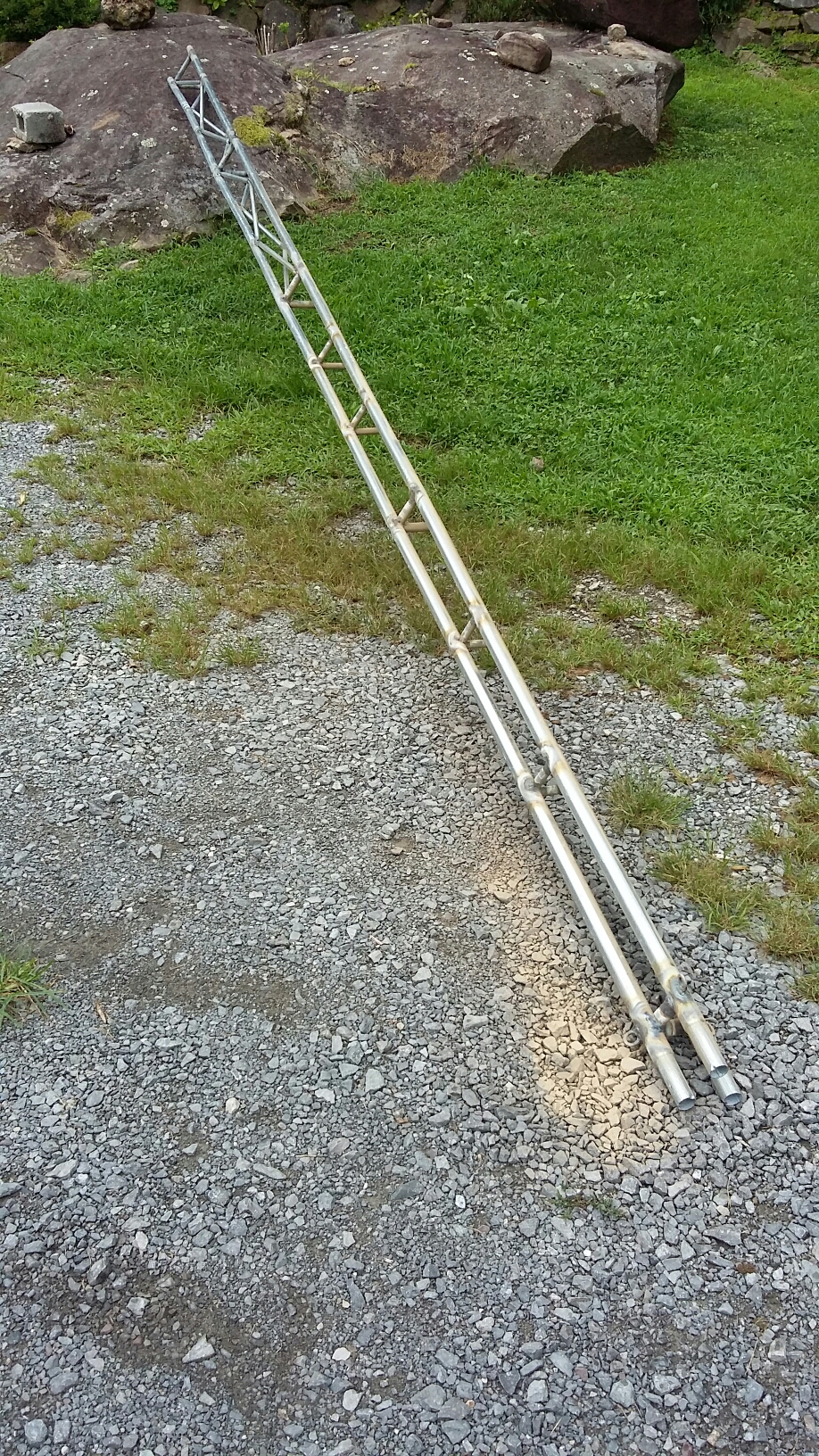 That said, I can already tell that this design is going to perform so much better than the last one. In that pic where I have that long section laid out, there was no sag even though it was only supported on the ends. The current standing tower would have sagged 4″ or better over the same length. Guy wire support should be much simpler to tune with this one (I can hear the current ones sing due to how high strung they are to hold the tower steady ). In addition, this one is set up further from the house and trees, as well as 18′ higher (current rig is only 24′) I shouldn’t have as many problems with low lying turbulence. All in all, I think it’s going to play a much bigger role this winter than what I have, did last winter. (And I won’t lie, the current genny leaves a lot to be desired in output even when it’s cranking over good. I am very disappointed on that purchase.)