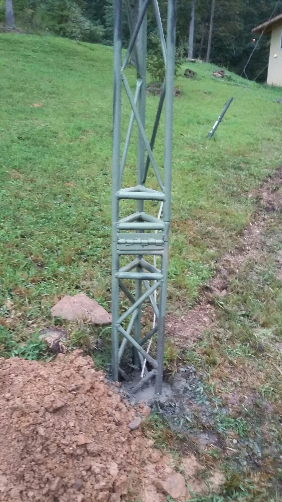 Lots done today, thanks to a friend from work. Tower base concreted in, ditch dug, conduit laid and the wire ran, all before noon! Woo-hoo, go us!
