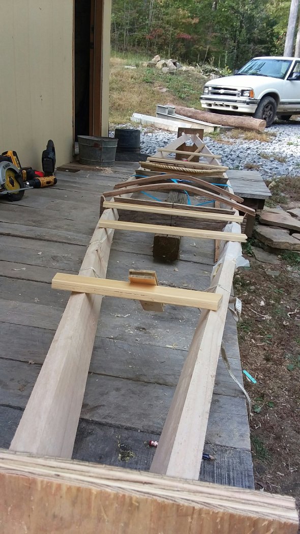 Gunwales matched, laid up things to get a feel for it, and adjust beam positions. Made lotsa little marks all over it, x-ing this position, shift that one, etc.