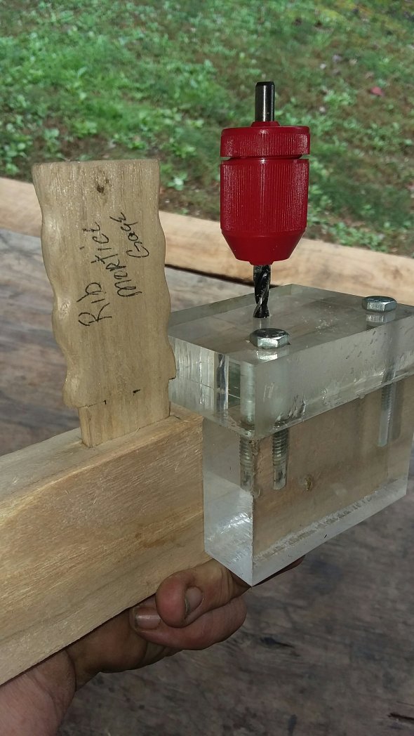 18 mortices at 3/8″x 1 1/8″, using a3/8″ Forstner bit and a jig. Thats 54 holes that need drilled. Easy peasy.