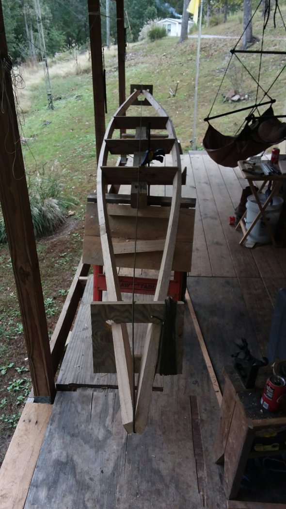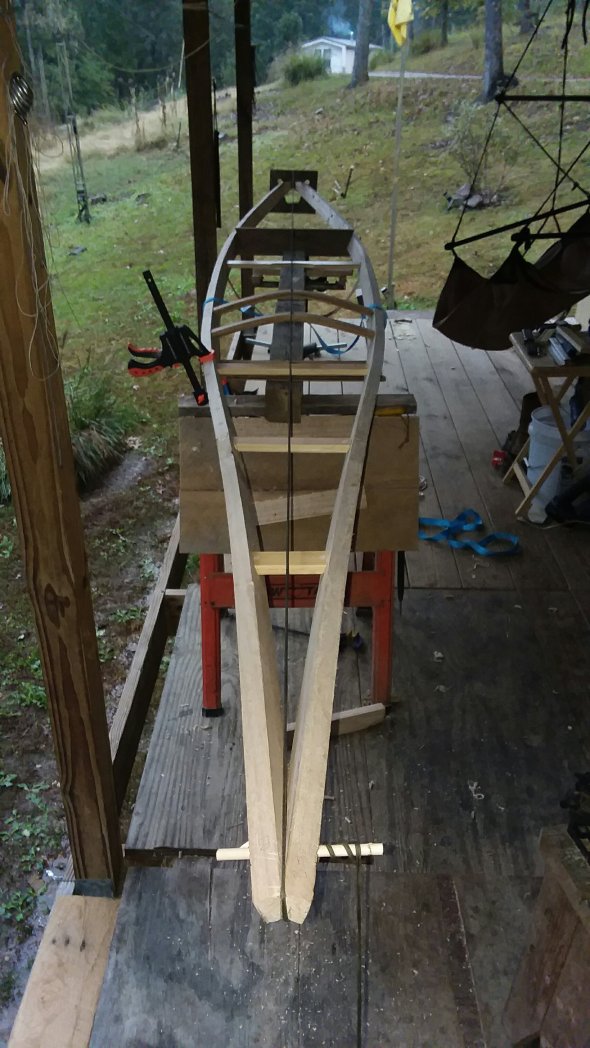 (This was where I stopped for the day.) Note the compound curve of the forward end. I want this boat to cut the water and that curve will help shape the bow for such.