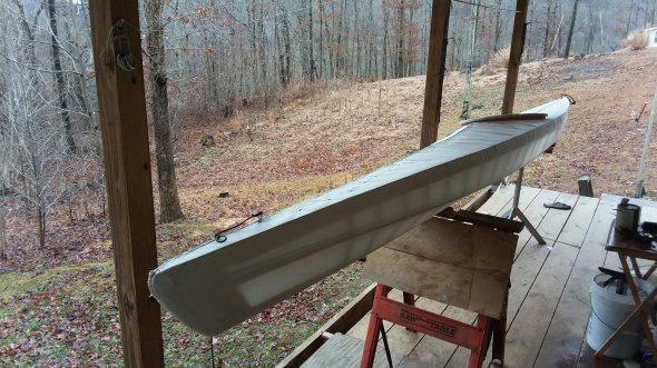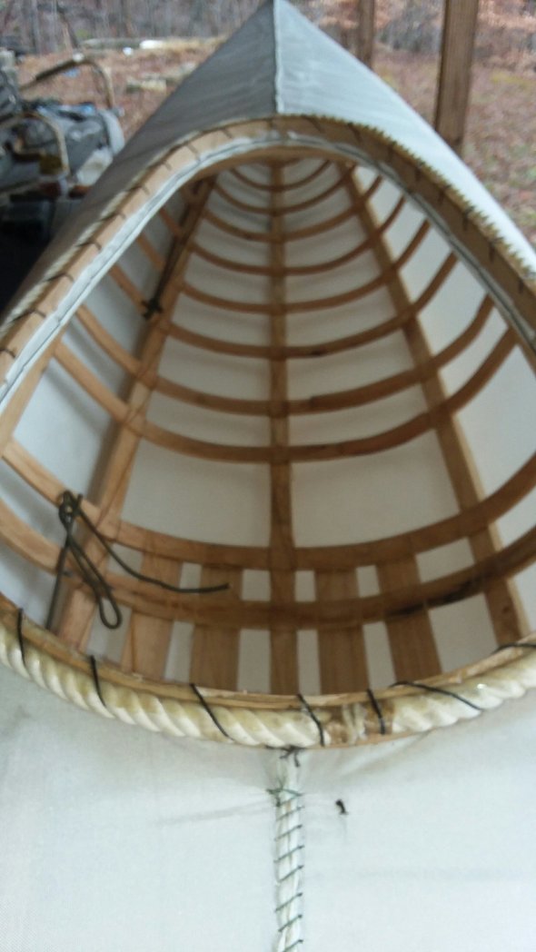 Just a coupla views to show progress. Still need to iron out some wrinkles from sewing, one from where the nylon was folded up and kinked; I just could not pull it flat while sewing and pulled a couple holes open more than I would like. No worries, they will seal up, but with more work and sealant than other places.