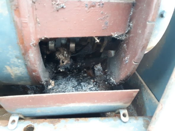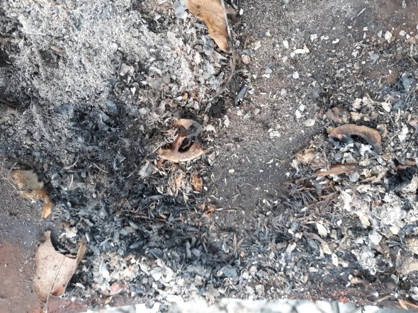 Finish pulling the cover and you can see where this nest caught a spark and started smouldering.