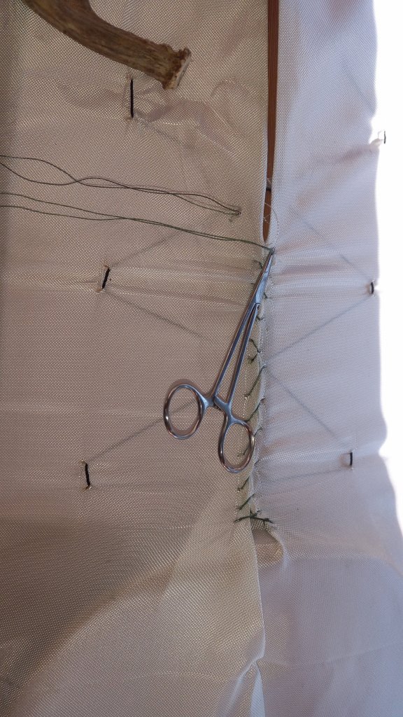 Like everything else about my skin boats, there is a blend of old and new. That thread is 65#test braided fishing line, doubled for sewing. Tough stuff. There is a piece of antler in the pic; thats what I use to really crank on the tension of that thread. Using bare fingers, I’d be cut to the bone with a quickness.(so use bone to tension thread, see my logic?) Because the thread is teflon coated, I can see up 3-4″, then wind it up super tight and set that hemostat in place for the next section.
