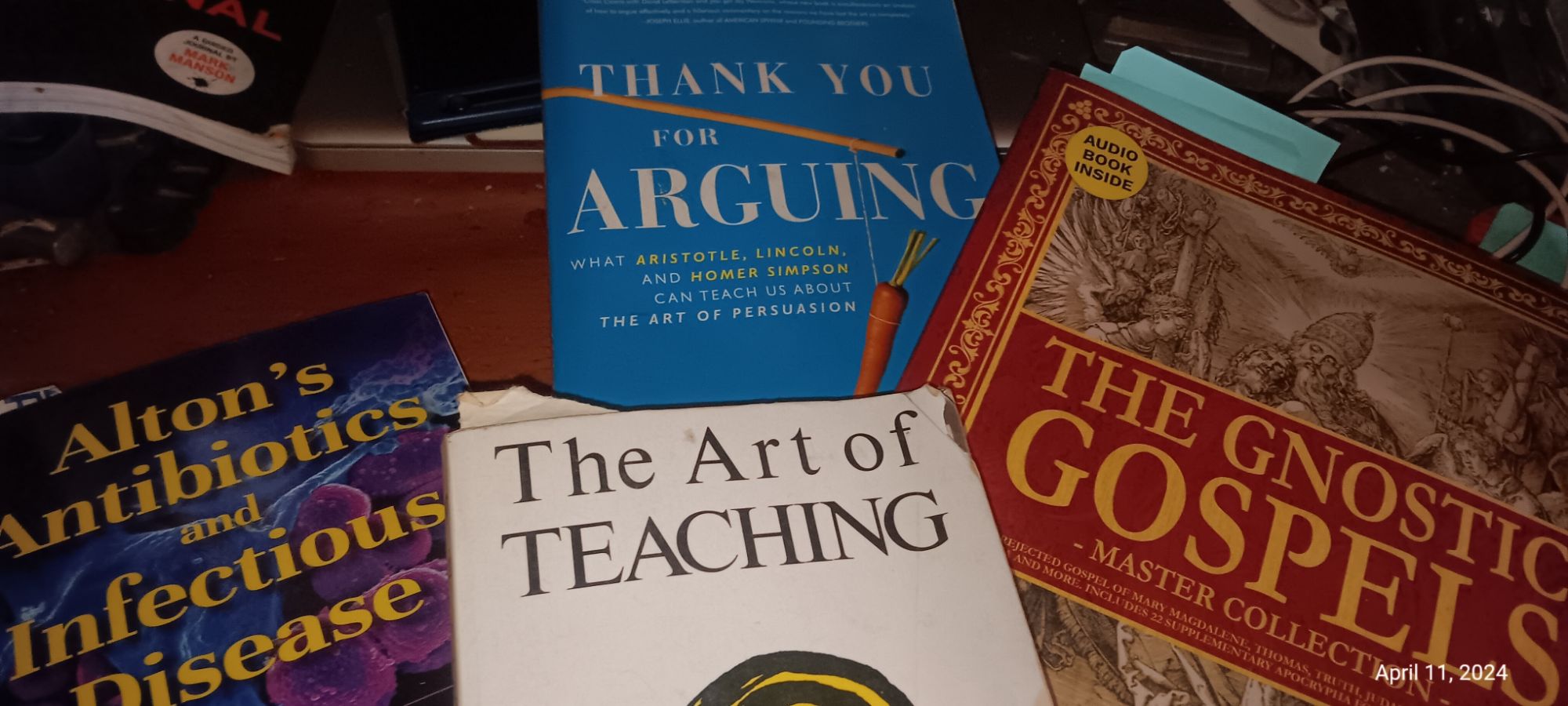The above: Rhetoric, laymans medicine, Education principles, and Theology (comparitve, I do A LOT of the comparitive. ) Despite the bleating of the Baptist ministers, I do NOT believe any ONE religion is the Ulitimate Truth. Take that particular tome above. Books that were removed from the Canonicals by Constantine,,, (and Constantine was was right around the break from Rome and the Orthodox ministries that are predominant in Asia.) Why were they removed? A mans answer is not sufficient to this Contrarian. I want to read them and see if there was serious confluence, influence, counter-influence, what have you, that would impell the clergy of that time to “Edit with Prejudice”.
