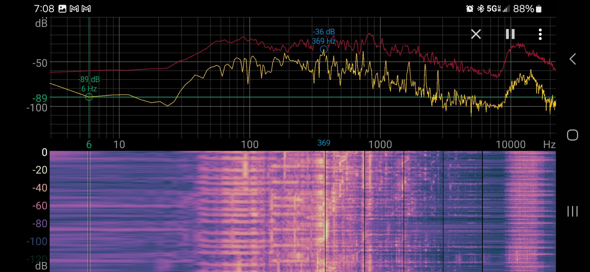 (updated after first draft: took phone out of case after I had uploaded all these screenshots. The signal description flattened out even further and that 10k hump smoothed out near flat with a beginning roll off around 15k. That is pretty typical of MP3 source, which are what I was playing. The case was ‘amplifying’ the 10k range, while hindering the 1200=10k rang with a dead spot at 6k.)