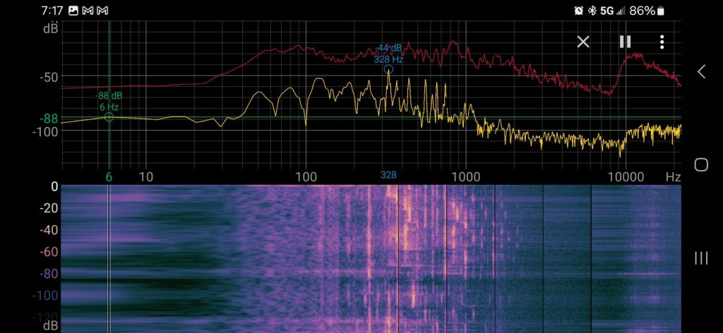 Thats mid song. Natalie Merchant Carnival is the song. Thats from 2meters off face. Granted, thats using the phone’s microphone (see update midpost) so it ain’t calibrated to any degree of accuracy and there may be a certain ‘tuning’ to it. (That spike at 10K is what I am suspecting is ‘tuned in’, seeing how most people can’t hear that frequency very well and it IS known as a comm signal between remote computerized systems. SO,,,, I’m not ruling out that there is some spike in the ‘speaker’ at the 10K point, but I am thinking its more the microphone,,,,ALSO; the phone is suspended from a Desklamp frame; kinda sorta isolated from external vibration. (really wish I had my Smaartlive and CALIBRATED microphones still. Sold them to a buddy in the system when I got out.)