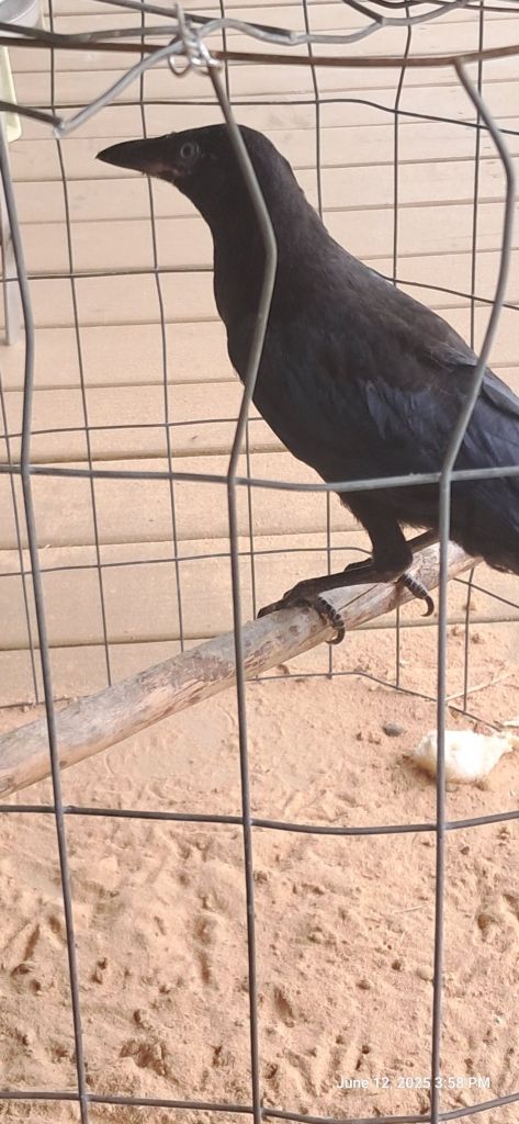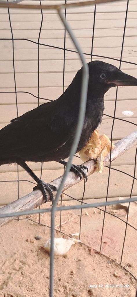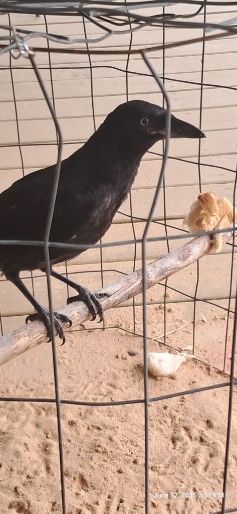 Da is back in the bird business.    He was coming home from running around and found a fledgling Crow walkin’ along the road.   IN full plumage, but not enough air experiance, so he was walking,,,,    Friendly little cuss too.    Takes food from hand,