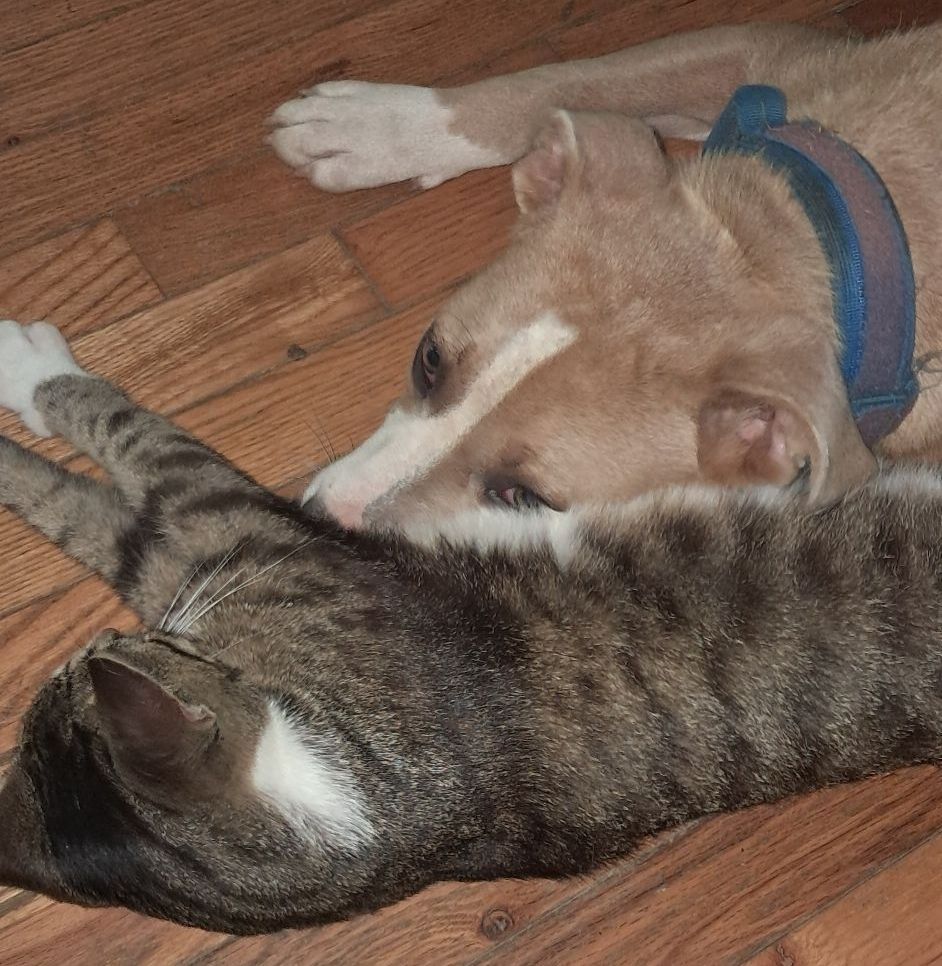 Mama still likes to hiss and growl at him, but the face swats have most entirely gone the wayside. I can’t say that about Zooms, but even there, its getting less frequent. As you can see in the above pic, Elbs and Coz are now KIN,,, they play constantly and there have been times where I found Elbs playng “Alien Facehugger” on Cozz, and Cozzies tail is in full wag mode,,,