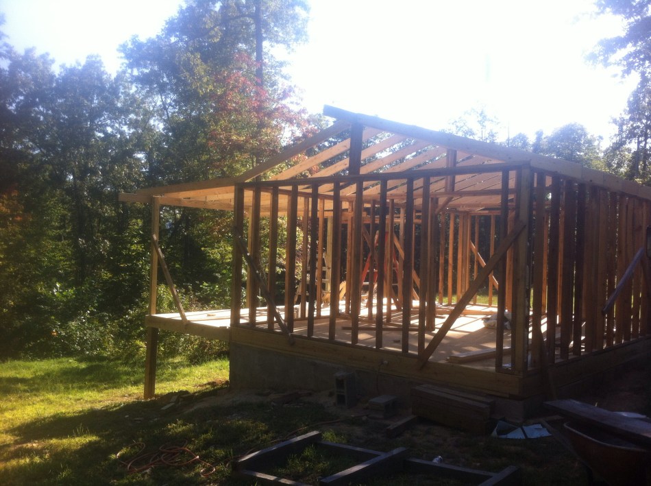 Well, I knew that I would need a shop, problem being, I was also highly in need of living arrangements: I was not going to spend another winter in an RV that was, quite literally, falling apart at the seams. (when I pulled the mattress out, there was a 4″ gap between the corners of that wall, wasn’t able to be seen from the outside, because the original owner had mounted a section of aluminum diamond plate back there to hide the damage. And I wondered why I always had cold feet, no matter how warm I kept that place.). When construction began, it was “HOUSE! NOW! shop later”.