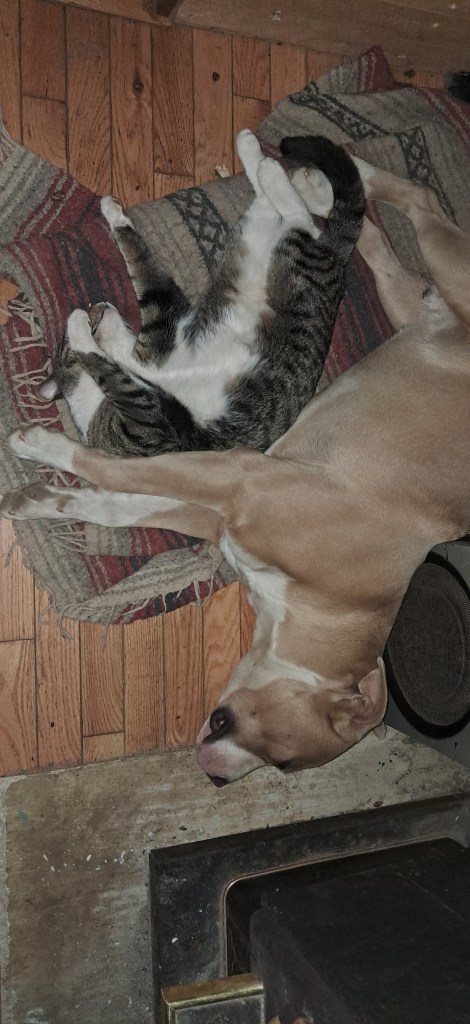 Wood stacked on porch, nummers on the shelf, Coffee aplenty and stack-o-books next to the desk waiting for me to ‘have a moment’. May have to deal with bored kittehs n pupper, but whats new on that front? So long as Elbs doesn’t have a teenager angst driven hissy fit while being in close quarters with Mama, we’ll be good. (the problem is, Elbs and Cozzie are BUDS and when Mama goes to put Elbs in line,,, well, buddy Cosmos has to come to his buddies aid, and things get out of hand then,,,)
