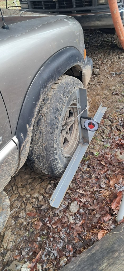 A couple o jigs I made to do alignments. The one has the angle gauge on it (magnetic mount, hot swappable!) (and do you see how wet my driveway is?!?!? Thats ground seepage from the hill, coming up through the gravels.)