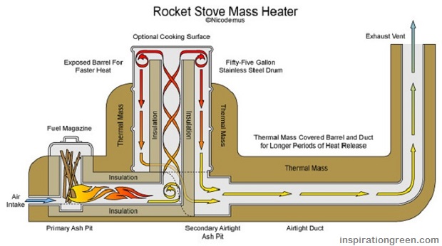 The concept is simple. Capture as much heat as you can before it leaves the house. Thats the whole purpose of these stoves. The Rocket stoves produce incredible amounts of heat, running at peak efficiency reducing emissions to base components of CO2 and H2O with minimal particulates. They generate ash in the ash bin, and some fly ash that accumulates over time in the chambers (and why they have clean out ports.) Everything else is normal and IMO non-pollutants. (the CO2 was gathered by the trees, and will be again. Perfect circle!)
