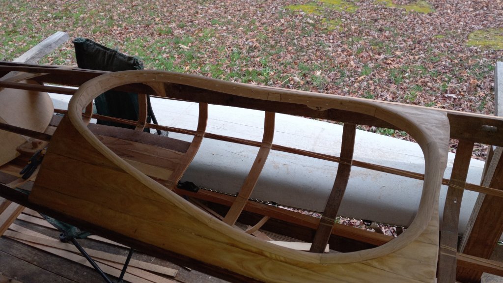 I wasn’t sitting on my duff doing nuttin’ all day. Been quite busy as you will see. I had that coaming about 2/5ths done last night, and today was spent ‘putting the polish’ on it. Mostly warping wood so that it followed curves.