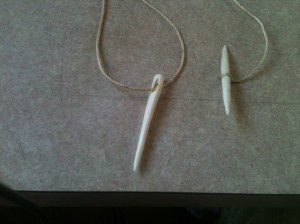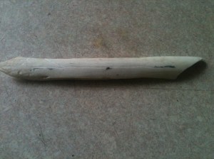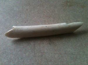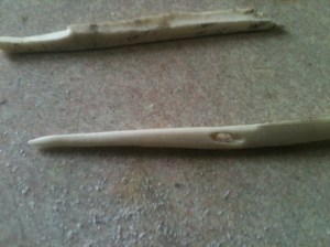 Each of these tools can be made from many different materials, but I chose bone for this one. You can substitute a hard wood if you have that available as the methods are the same. The only reason I don’t recommend hardwood for the needle is the grain; it may not be fine enough to make the eye and still be solid. The grain in bone (yes it has one as you will find out by doing) is extremely fine and able to hold that eye in place, even when pulling sinew through leather.