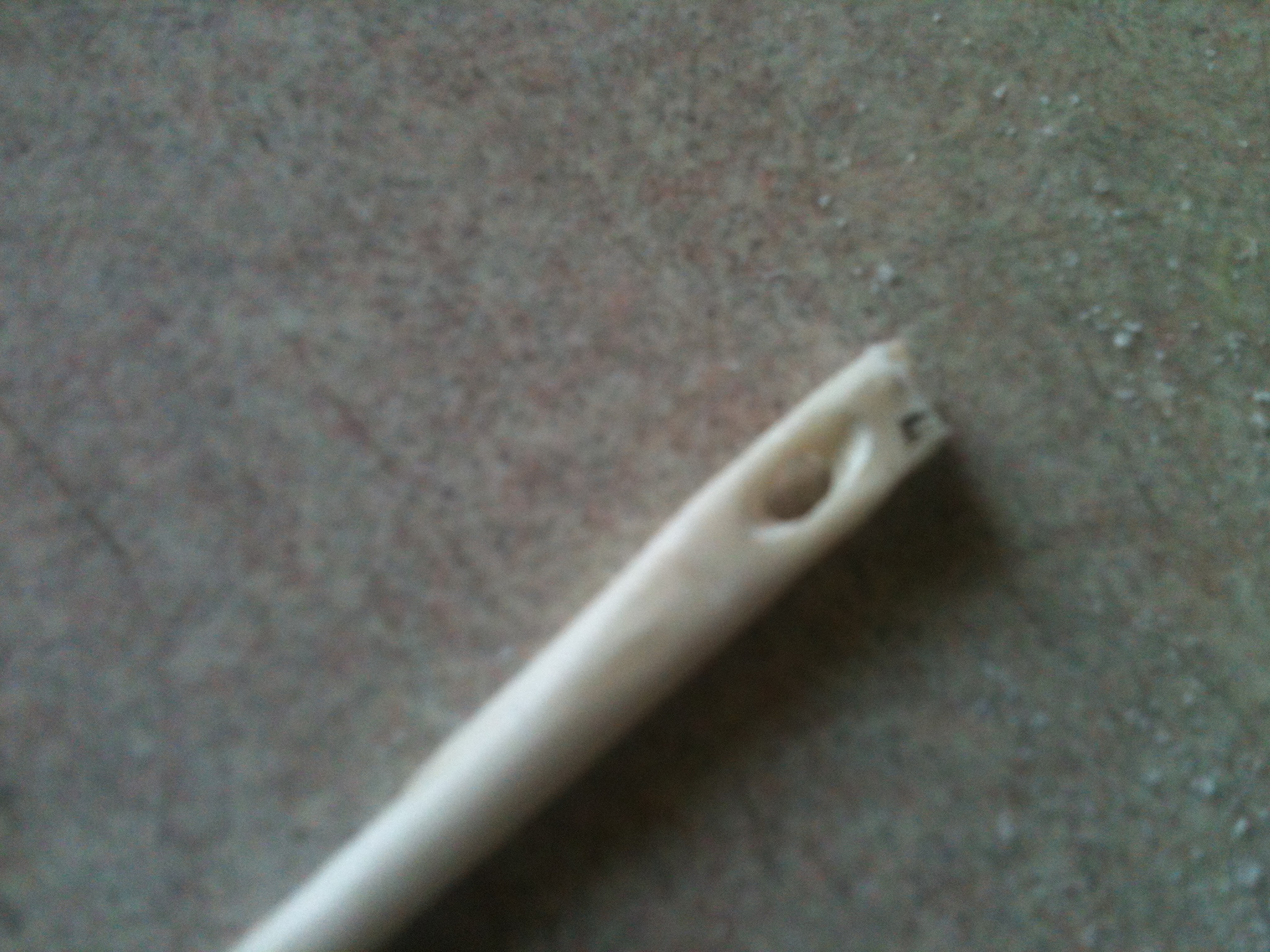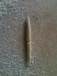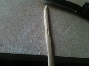 Now that you have the shape of the needle, its time to pull that needle off the bone. Score a line around the area above the eye. The best way to do this is with a serrated edge or similar. You don’t need to cut very deep either: just about 1/10th of the diameter. Hold the eye firmly between fingers or a pair of pliers or something similar and snap your working handle loose.