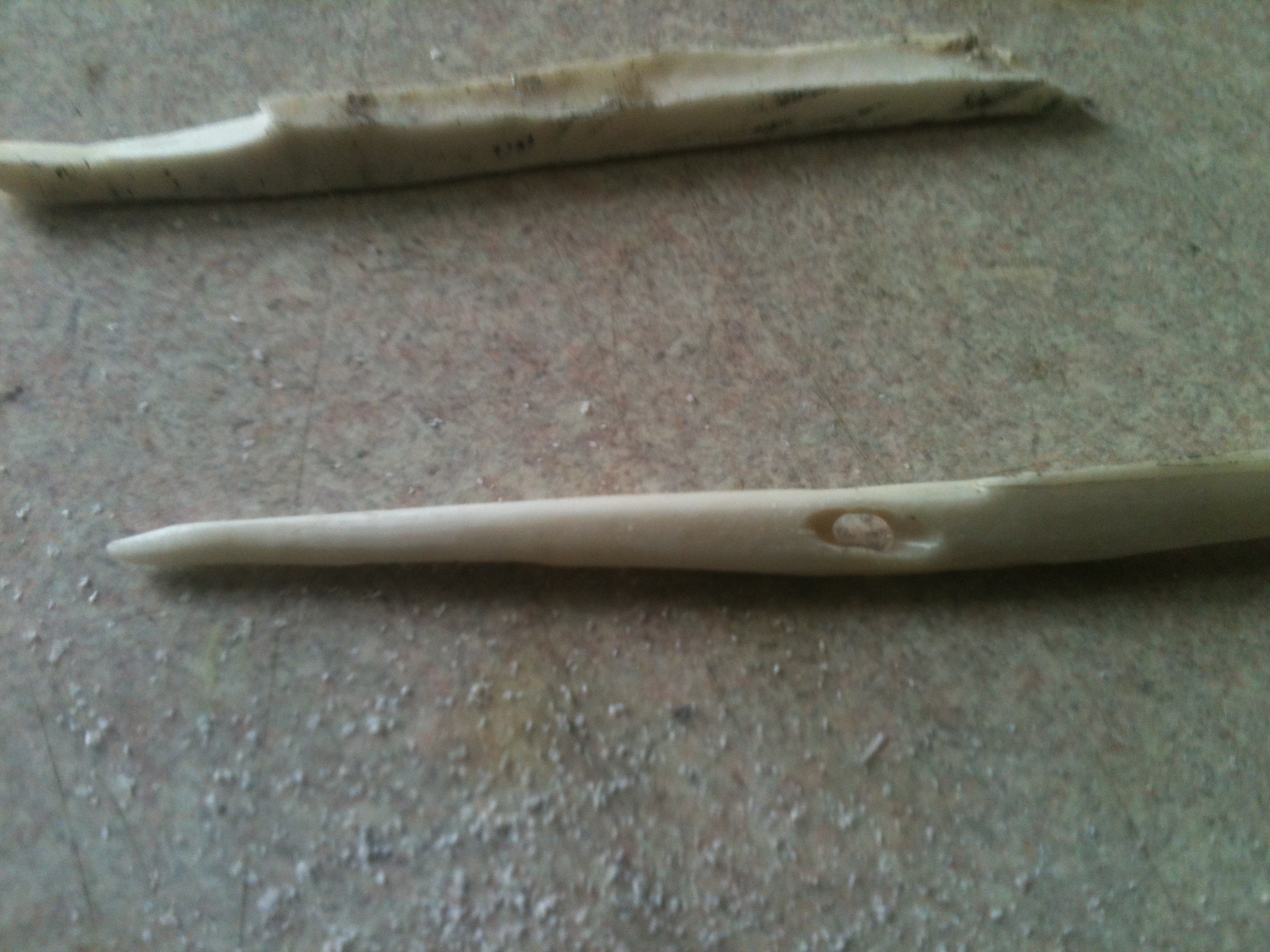 If you are making the needle, now is the time to make the eye. Do this so that you have the half of the length to hold while scraping the needle out of the bone. The eye is your reference point for symmetry.