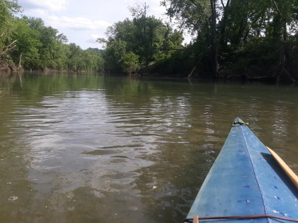 Sunday, after I finished my wknd chores of keeping my self and stead operational, decided my first boat was in need of some h2o time too. Duh!kee hasn’t seen water since last September when she squealed and had her hull ruptured. Repair made, but never tested. It was 84, rivers up about a foot and flowing fast, but Duh!k likes fast water. Water temp was near 60, chilly but ‘knock you to your knees’ cold.