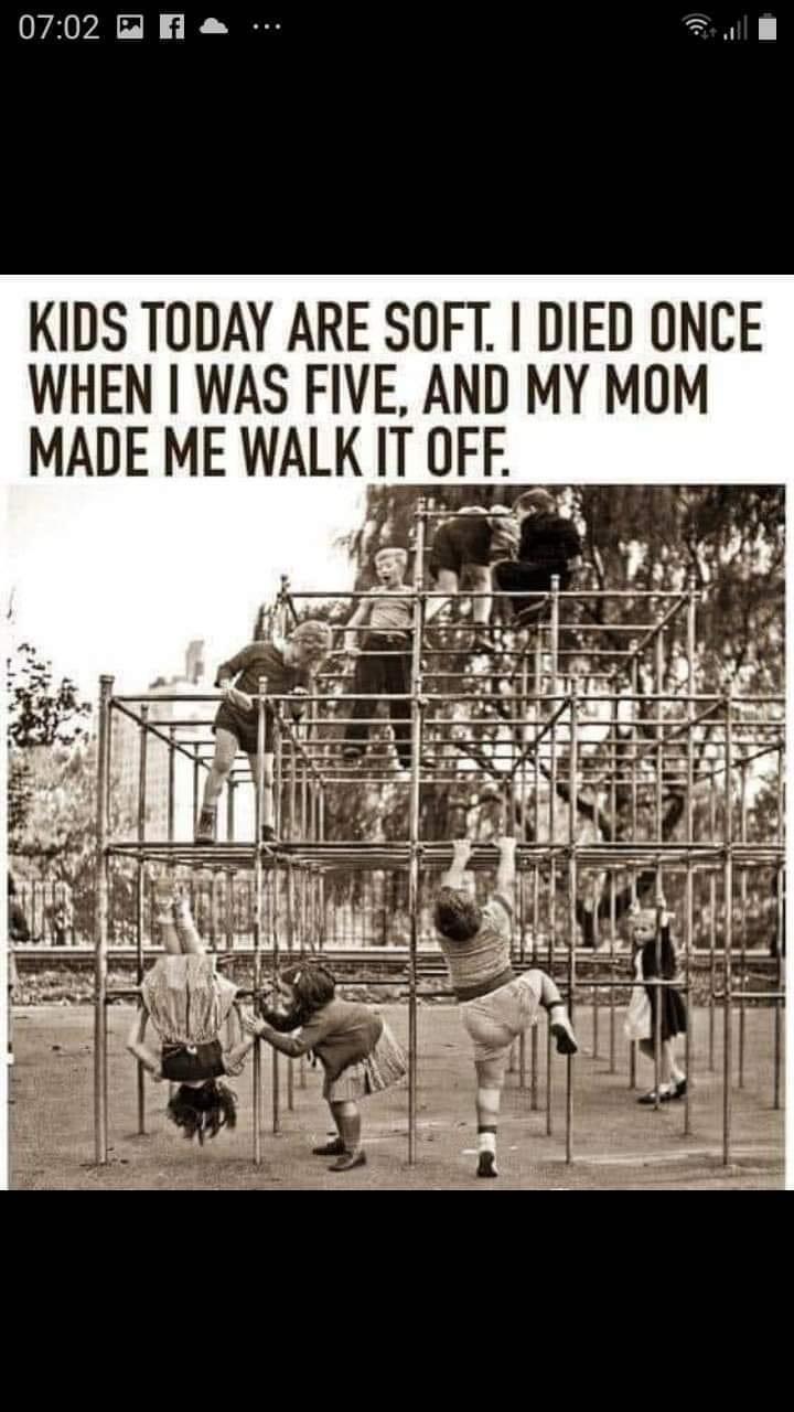 Iron bars, embedded in concrete, on black asphalt playgrounds, two miles from the sun, that would melt the soles of your sneakers,,, by comparison, kids today live in bubble wrap,,,,