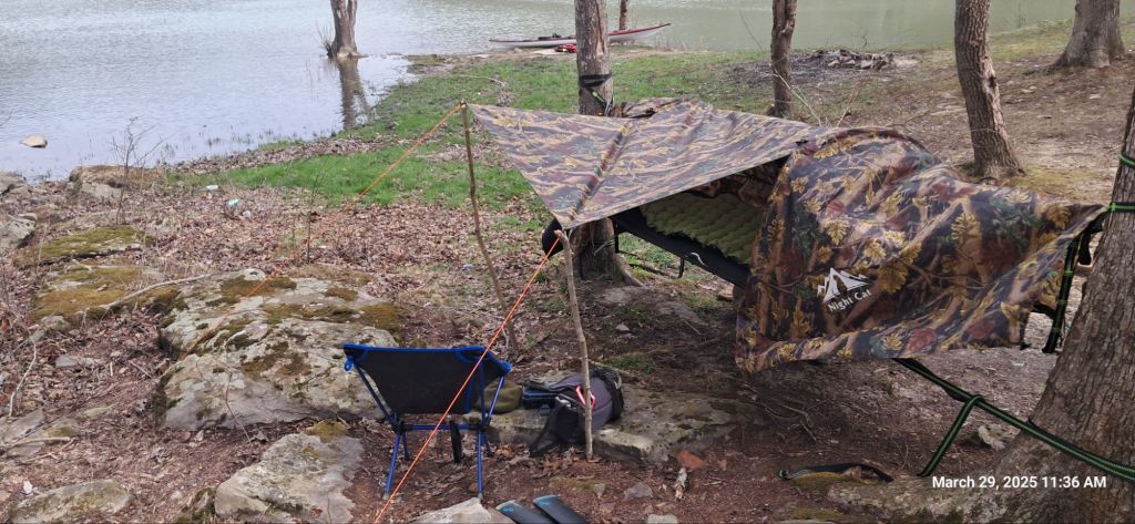 One bad note on the construction of the tent. The toggles to tie back the fly entrance are located at the far ends of the opening. They can’t tie it back. I did see a couple of other reviewers say the same thing, so this is a design flaw, not a quality control issue. They should be located about 1/4-1/3 from the edge of the opening. For that reason I set the opening up as a tarp, and it did have the loops to do so.(the kit also had the guylines and 2 stakes to accomplish this. Sticks or trekking poles work well: paddles do not 😥)