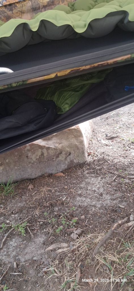 I know the fly looks loosey-goosey (and is): that can and will be rectified by finding trees further apart than the ones I chose here; At least another 2′ apart. The top straps are at their minimum length for set up, so wider is better. The rainfly attaches to the straps outside of where the carabiners hook in: right now, it is on top of the ‘biners. I’m gonna have to adapt to this one as these trees are the perfect distance for my old hammock.